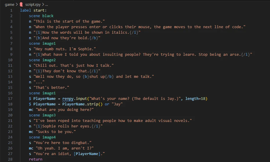 You’ll also notice that I’ve added {i} and {b} in some places. Everything after {i} will be in italics. {/i} tells Ren’Py when the italics ends. {b} follows the exact same principal but is for bold. The start and end of every line you want to italicise or make bold should have these markers, even if the following line has the same setting.